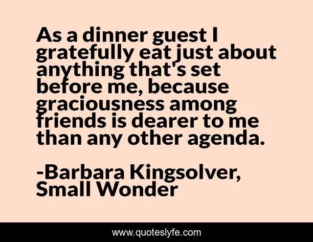 This page presents the quote "As a dinner guest I gratefully eat just about anything that's set before me, because graciousness among friends is dearer to me than any other agenda.". Author of this quote is Barbara Kingsolver, Small Wonder. This quote is about graciousness, sharing, guest, food, hospitality, friendship, meals,.