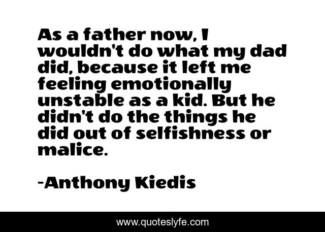This page presents the quote "As a father now, I wouldn't do what my dad did, because it left me feeling emotionally unstable as a kid. But he didn't do the things he did out of selfishness or malice.". Author of this quote is Anthony Kiedis. This quote is about me, selfishness, father,.