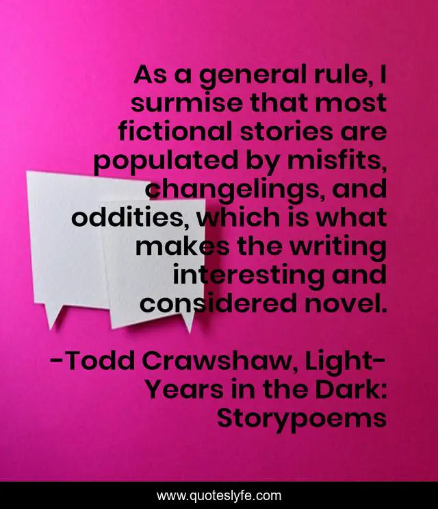 This page presents the quote "As a general rule, I surmise that most fictional stories are populated by misfits, changelings, and oddities, which is what makes the writing interesting and considered novel.". Author of this quote is Todd Crawshaw, Light-Years in the Dark: Storypoems. This quote is about novel-writing, creativity, fiction,.