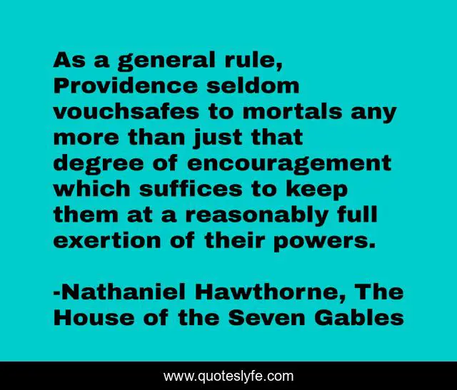 This page presents the quote "As a general rule, Providence seldom vouchsafes to mortals any more than just that degree of encouragement which suffices to keep them at a reasonably full exertion of their powers.". Author of this quote is Nathaniel Hawthorne, The House of the Seven Gables. This quote is about faith, strength,.