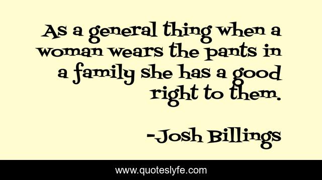 This page presents the quote "As a general thing when a woman wears the pants in a family she has a good right to them.". Author of this quote is Josh Billings. This quote is about ancestry, family,.