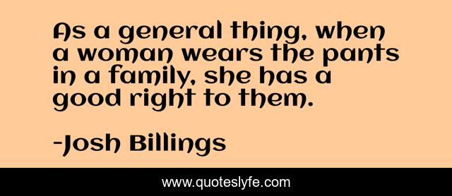 This page presents the quote "As a general thing, when a woman wears the pants in a family, she has a good right to them.". Author of this quote is Josh Billings. This quote is about good, woman, she,.
