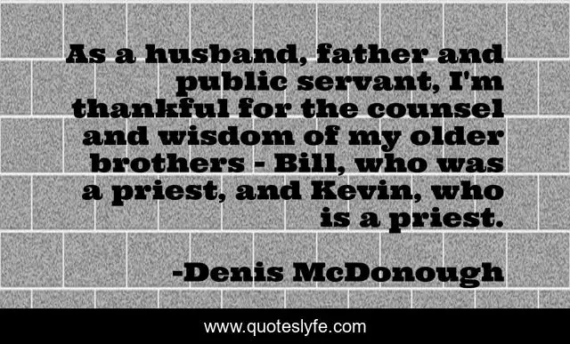 This page presents the quote "As a husband, father and public servant, I'm thankful for the counsel and wisdom of my older brothers - Bill, who was a priest, and Kevin, who is a priest.". Author of this quote is Denis McDonough. This quote is about father, husband, wisdom,.
