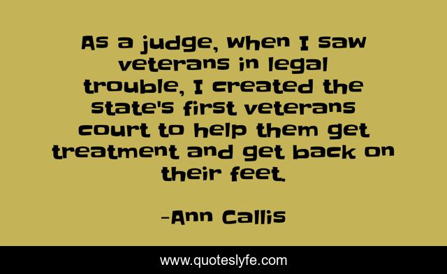 This page presents the quote "As a judge, when I saw veterans in legal trouble, I created the state's first veterans court to help them get treatment and get back on their feet.". Author of this quote is Ann Callis. This quote is about feet, veterans, help,.