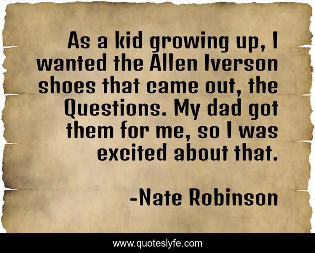 This page presents the quote "As a kid growing up, I wanted the Allen Iverson shoes that came out, the Questions. My dad got them for me, so I was excited about that.". Author of this quote is Nate Robinson. This quote is about me, growing up, shoes,.
