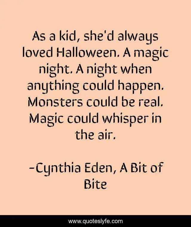 This page presents the quote "As a kid, she'd always loved Halloween. A magic night. A night when anything could happen. Monsters could be real. Magic could whisper in the air.". Author of this quote is Cynthia Eden, A Bit of Bite. This quote is about halloween, mosnters, magic,.