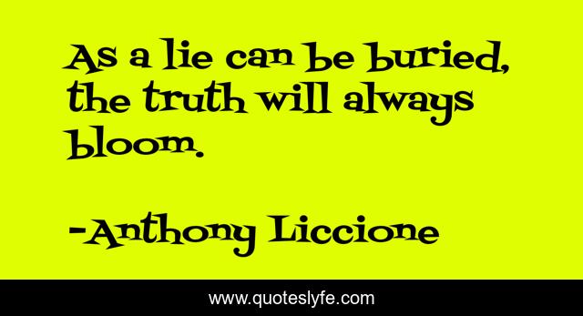 This page presents the quote "As a lie can be buried, the truth will always bloom.". Author of this quote is Anthony Liccione. This quote is about show, surface, withhold, flourish, keep-quiet, lie, come-out, hide, darkness,.
