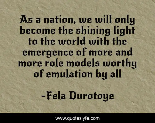 This page presents the quote "As a nation, we will only become the shining light to the world with the emergence of more and more role models worthy of emulation by all". Author of this quote is Fela Durotoye. This quote is about light, nation-builder, excellence, role-model, world, nigeria,.