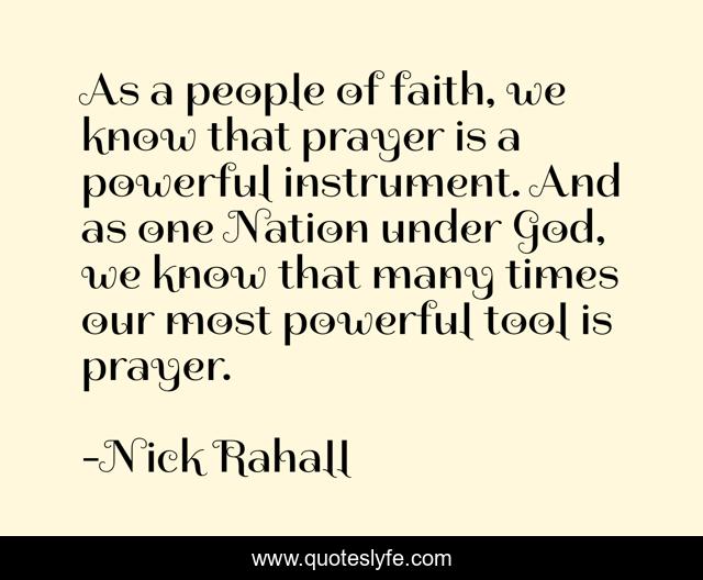 This page presents the quote "As a people of faith, we know that prayer is a powerful instrument. And as one Nation under God, we know that many times our most powerful tool is prayer.". Author of this quote is Nick Rahall. This quote is about god, powerful, prayer,.