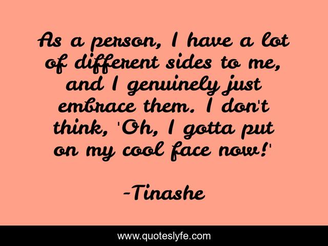 This page presents the quote "As a person, I have a lot of different sides to me, and I genuinely just embrace them. I don't think, 'Oh, I gotta put on my cool face now!'". Author of this quote is Tinashe. This quote is about me, think, face,.