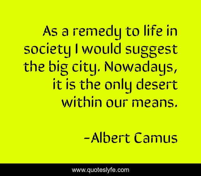 This page presents the quote "As a remedy to life in society I would suggest the big city. Nowadays, it is the only desert within our means.". Author of this quote is Albert Camus. This quote is about city, loneliness, desert, society,.