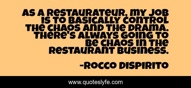 This page presents the quote "As a restaurateur, my job is to basically control the chaos and the drama. There's always going to be chaos in the restaurant business.". Author of this quote is Rocco DiSpirito. This quote is about control, job, chaos,.