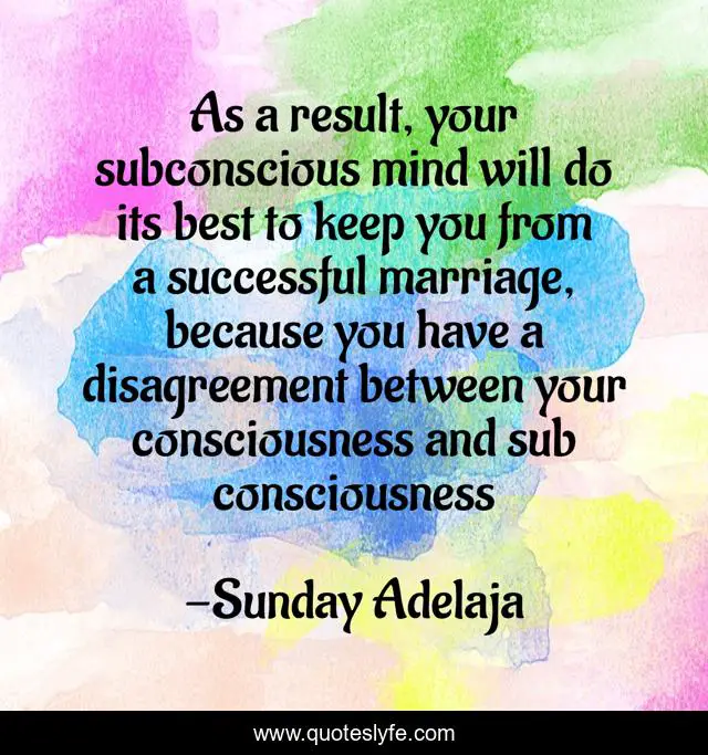 This page presents the quote "As a result, your subconscious mind will do its best to keep you from a successful marriage, because you have a disagreement between your consciousness and sub consciousness". Author of this quote is Sunday Adelaja. This quote is about result, life, goal, consciousness, successful, mind, disagreement, mission, keep,.