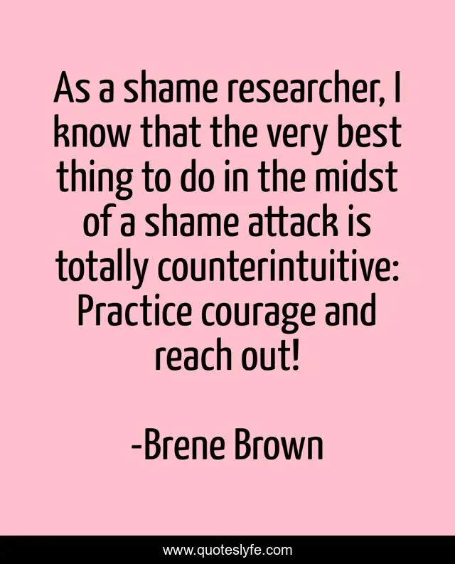 This page presents the quote "As a shame researcher, I know that the very best thing to do in the midst of a shame attack is totally counterintuitive: Practice courage and reach out!". Author of this quote is Brene Brown. This quote is about practice, best,.