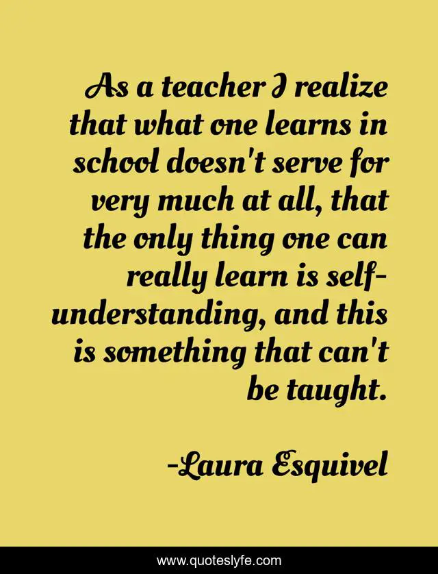 This page presents the quote "As a teacher I realize that what one learns in school doesn't serve for very much at all, that the only thing one can really learn is self-understanding, and this is something that can't be taught.". Author of this quote is Laura Esquivel. This quote is about school, realize, learn,.