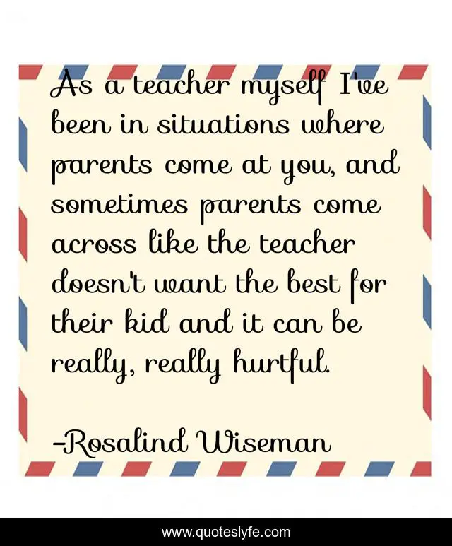 This page presents the quote "As a teacher myself I've been in situations where parents come at you, and sometimes parents come across like the teacher doesn't want the best for their kid and it can be really, really hurtful.". Author of this quote is Rosalind Wiseman. This quote is about myself, parents, best,.