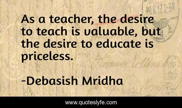 This page presents the quote "As a teacher, the desire to teach is valuable, but the desire to educate is priceless.". Author of this quote is Debasish Mridha. This quote is about desire, educate, love, knowledge, inspirational, intelligence, philosophy, life, valuable,.