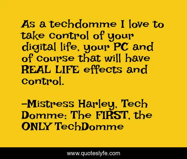 This page presents the quote "As a techdomme I love to take control of your digital life, your PC and of course that will have REAL LIFE effects and control.". Author of this quote is Mistress Harley, Tech Domme: The FIRST, the ONLY TechDomme. This quote is about mistress, findom, erotica, femdom, how-to,.