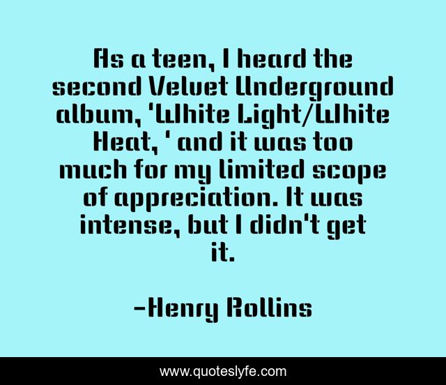 This page presents the quote "As a teen, I heard the second Velvet Underground album, 'White Light/White Heat, ' and it was too much for my limited scope of appreciation. It was intense, but I didn't get it.". Author of this quote is Henry Rollins. This quote is about appreciation, heat, velvet,.