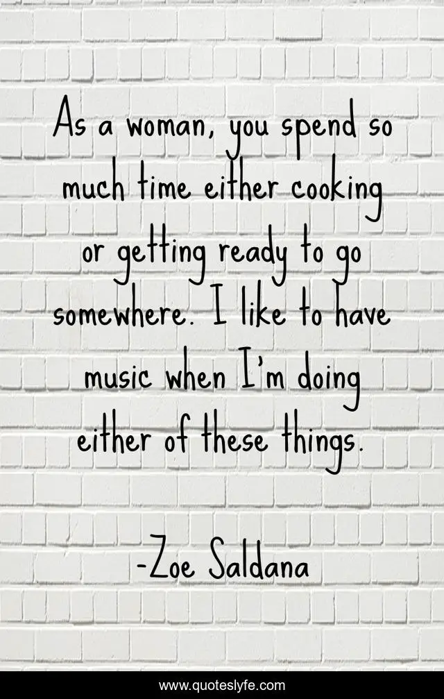 This page presents the quote "As a woman, you spend so much time either cooking or getting ready to go somewhere. I like to have music when I'm doing either of these things.". Author of this quote is Zoe Saldana. This quote is about woman, cooking, time,.