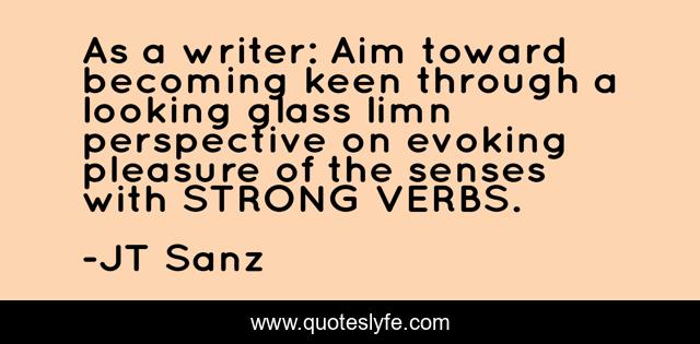 This page presents the quote "As a writer: Aim toward becoming keen through a looking glass limn perspective on evoking pleasure of the senses with STRONG VERBS.". Author of this quote is JT Sanz. This quote is about writing-philosophy, writers-on-writing, writing-craft, writers,.