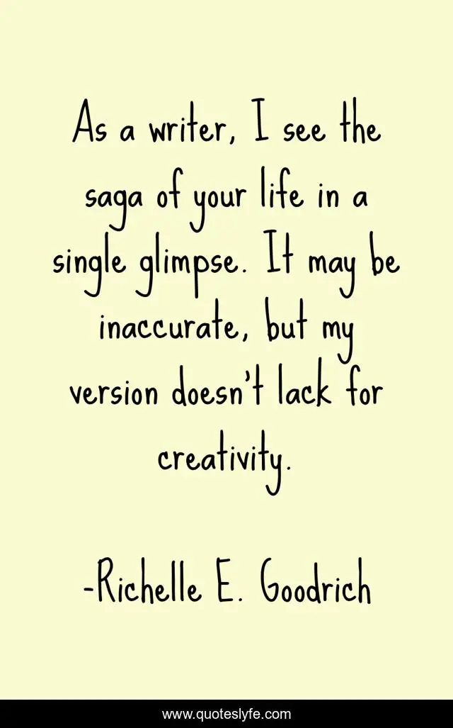 This page presents the quote "As a writer, I see the saga of your life in a single glimpse. It may be inaccurate, but my version doesn't lack for creativity.". Author of this quote is Richelle E. Goodrich. This quote is about imagery, author, richelle-e-goodrich, insight, creativity, adventures, imagination, richelle, richelle-goodrich,.