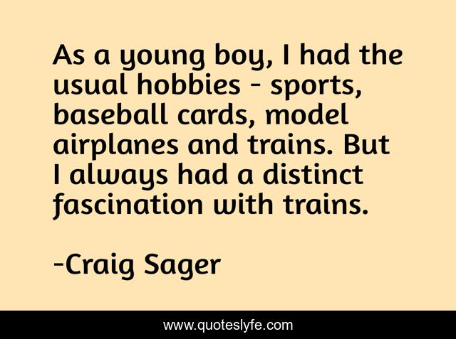 This page presents the quote "As a young boy, I had the usual hobbies - sports, baseball cards, model airplanes and trains. But I always had a distinct fascination with trains.". Author of this quote is Craig Sager. This quote is about cards, baseball, young,.