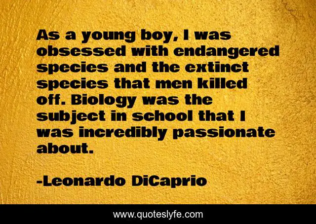 This page presents the quote "As a young boy, I was obsessed with endangered species and the extinct species that men killed off. Biology was the subject in school that I was incredibly passionate about.". Author of this quote is Leonardo DiCaprio. This quote is about school, biology, young,.