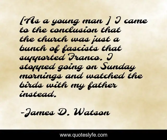 This page presents the quote "[As a young man ] I came to the conclusion that the church was just a bunch of fascists that supported Franco. I stopped going on Sunday mornings and watched the birds with my father instead.". Author of this quote is James D. Watson. This quote is about sunday, church, franco, fascists, conclusion,.