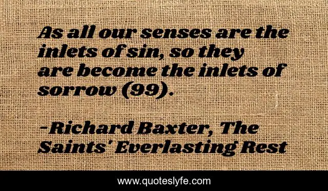 This page presents the quote "As all our senses are the inlets of sin, so they are become the inlets of sorrow (99).". Author of this quote is Richard Baxter, The Saints' Everlasting Rest. This quote is about introspection, sorrow, puritanical, sin,.