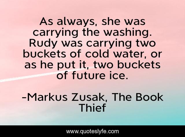 This page presents the quote "As always, she was carrying the washing. Rudy was carrying two buckets of cold water, or as he put it, two buckets of future ice.". Author of this quote is Markus Zusak, The Book Thief. This quote is about funny, comedy,.