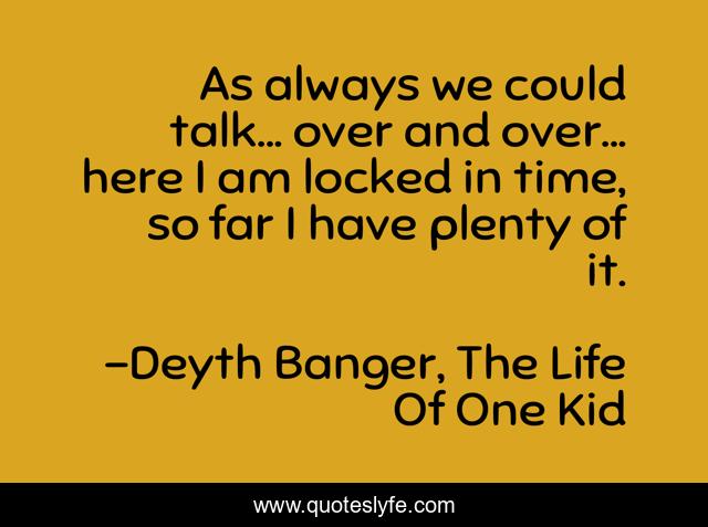 This page presents the quote "As always we could talk... over and over... here I am locked in time, so far I have plenty of it.". Author of this quote is Deyth Banger, The Life Of One Kid. This quote is about play, talk, time,.