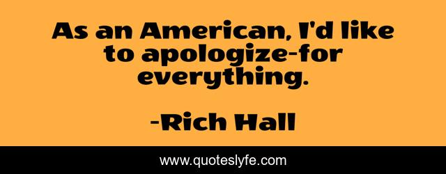 This page presents the quote "As an American, I'd like to apologize-for everything.". Author of this quote is Rich Hall. This quote is about apologies, americans, america, humor,.