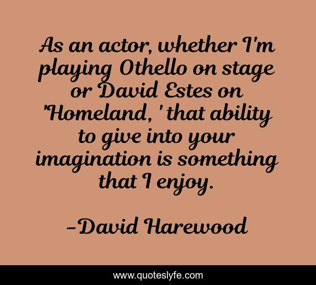 This page presents the quote "As an actor, whether I'm playing Othello on stage or David Estes on 'Homeland, ' that ability to give into your imagination is something that I enjoy.". Author of this quote is David Harewood. This quote is about enjoy, ability, actor,.