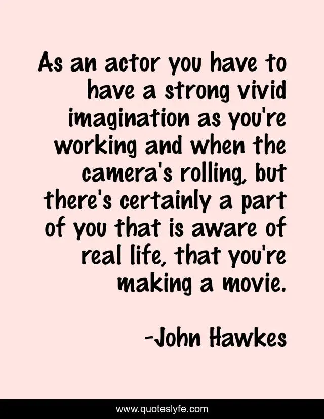 This page presents the quote "As an actor you have to have a strong vivid imagination as you're working and when the camera's rolling, but there's certainly a part of you that is aware of real life, that you're making a movie.". Author of this quote is John Hawkes. This quote is about life, camera, strong,.