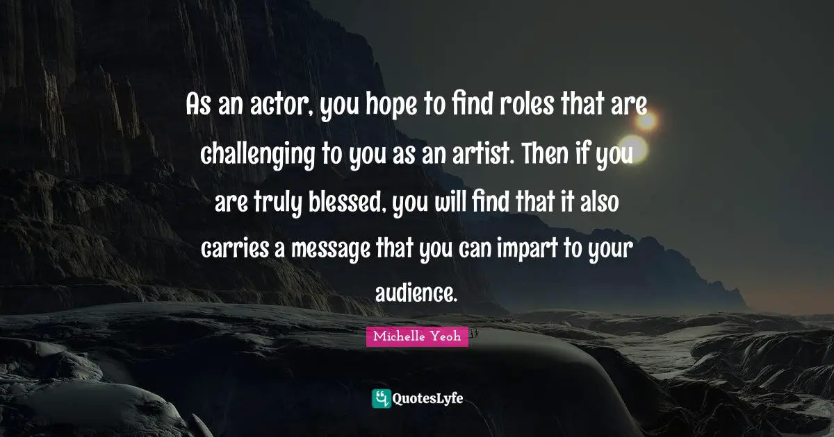 This page presents the quote "As an actor, you hope to find roles that are challenging to you as an artist. Then if you are truly blessed, you will find that it also carries a message that you can impart to your audience.". Author of this quote is Michelle Yeoh. This quote is about audience, challenges, roles, blessed, impart, artist, hope,.