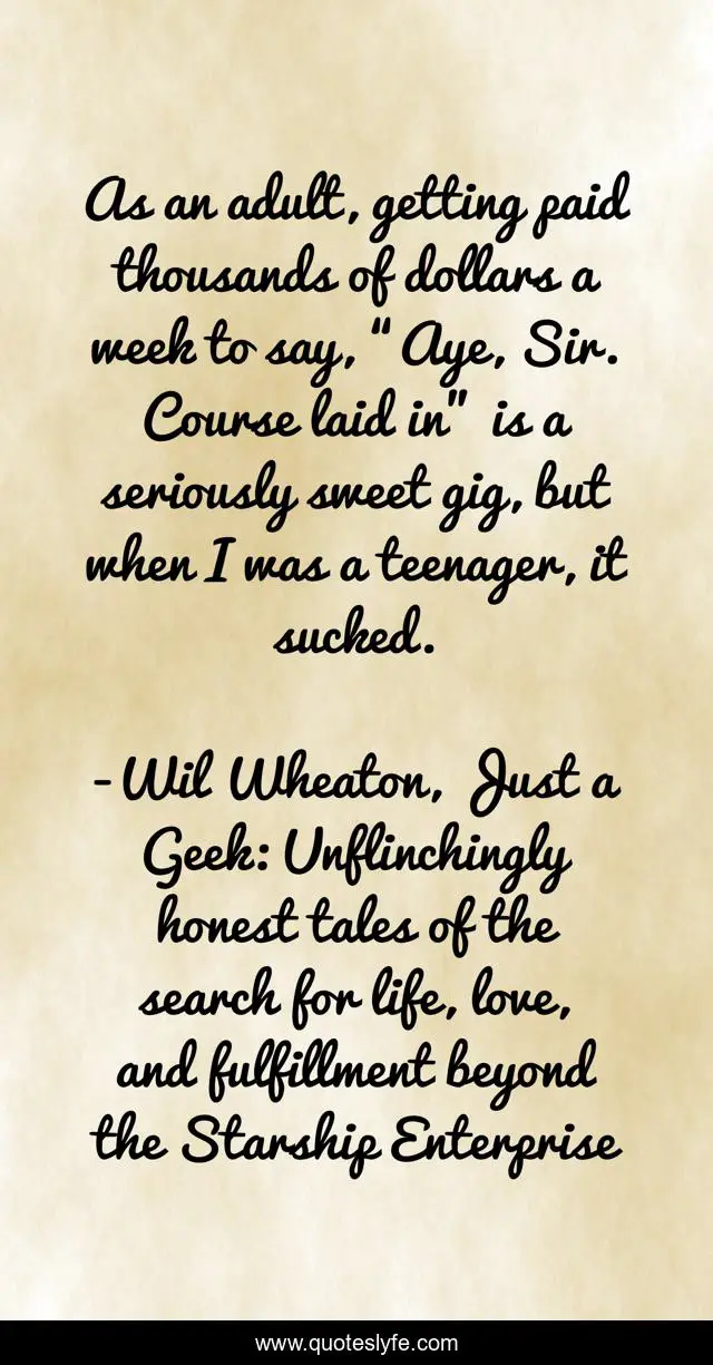 This page presents the quote "As an adult, getting paid thousands of dollars a week to say, “Aye, Sir. Course laid in” is a seriously sweet gig, but when I was a teenager, it sucked.". Author of this quote is Wil Wheaton, Just a Geek: Unflinchingly honest tales of the search for life, love, and fulfillment beyond the Starship Enterprise. This quote is about acting, humor, memoir, star-trek,.