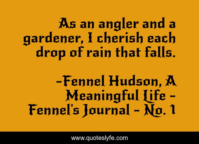 This page presents the quote "As an angler and a gardener, I cherish each drop of rain that falls.". Author of this quote is Fennel Hudson, A Meaningful Life - Fennel's Journal - No. 1. This quote is about rainfall, gardening, rain, water, fishing, angler, gardener,.