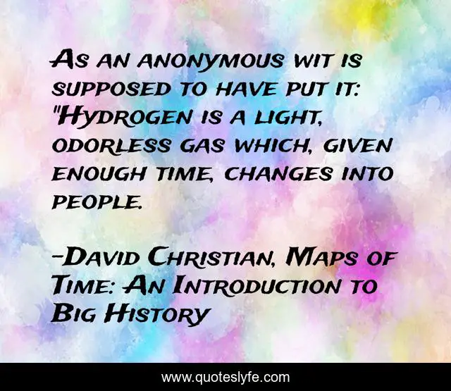 This page presents the quote "As an anonymous wit is supposed to have put it: "Hydrogen is a light, odorless gas which, given enough time, changes into people.". Author of this quote is David Christian, Maps of Time: An Introduction to Big History. This quote is about science, evolution, humor,.
