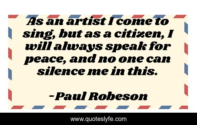 This page presents the quote "As an artist I come to sing, but as a citizen, I will always speak for peace, and no one can silence me in this.". Author of this quote is Paul Robeson. This quote is about speak, silence, artist,.