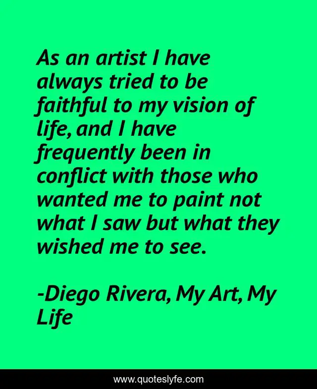 This page presents the quote "As an artist I have always tried to be faithful to my vision of life, and I have frequently been in conflict with those who wanted me to paint not what I saw but what they wished me to see.". Author of this quote is Diego Rivera, My Art, My Life. This quote is about life, art, artistic-vision, artists, painting, vision,.