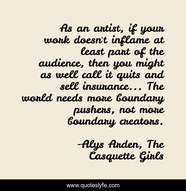This page presents the quote "As an artist, if your work doesn't inflame at least part of the audience, then you might as well call it quits and sell insurance... The world needs more boundary pushers, not more boundary creators.". Author of this quote is Alys Arden, The Casquette Girls. .