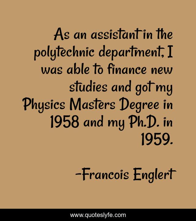 This page presents the quote "As an assistant in the polytechnic department, I was able to finance new studies and got my Physics Masters Degree in 1958 and my Ph.D. in 1959.". Author of this quote is Francois Englert. This quote is about new, masters, physics,.