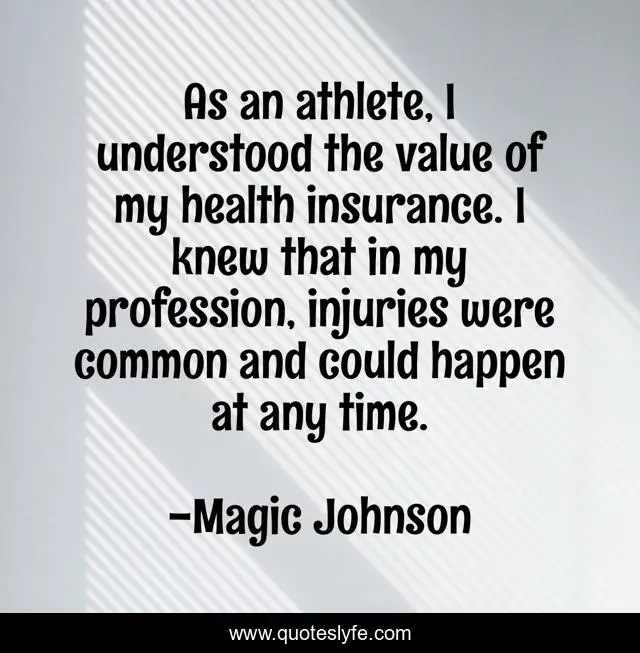 This page presents the quote "As an athlete, I understood the value of my health insurance. I knew that in my profession, injuries were common and could happen at any time.". Author of this quote is Magic Johnson. This quote is about insurance, value, time,.