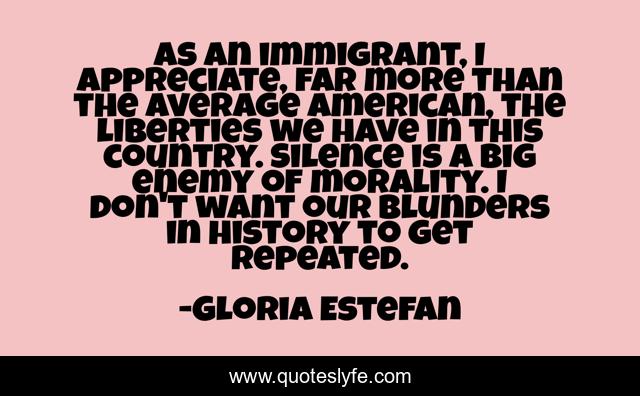 This page presents the quote "As an immigrant, I appreciate, far more than the average American, the liberties we have in this country. Silence is a big enemy of morality. I don't want our blunders in history to get repeated.". Author of this quote is Gloria Estefan. This quote is about american, silence, morality,.