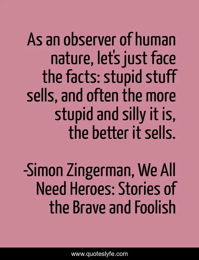 This page presents the quote "As an observer of human nature, let's just face the facts: stupid stuff sells, and often the more stupid and silly it is, the better it sells.". Author of this quote is Simon Zingerman, We All Need Heroes: Stories of the Brave and Foolish. This quote is about life, good-hearted, art, success, business, marketing, philosophy, creativity, goodness,.