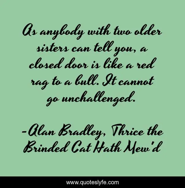This page presents the quote "As anybody with two older sisters can tell you, a closed door is like a red rag to a bull. It cannot go unchallenged.". Author of this quote is Alan Bradley, Thrice the Brinded Cat Hath Mew'd. This quote is about sisters, family,.