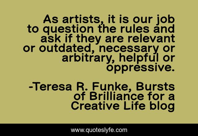 This page presents the quote "As artists, it is our job to question the rules and ask if they are relevant or outdated, necessary or arbitrary, helpful or oppressive.". Author of this quote is Teresa R. Funke, Bursts of Brilliance for a Creative Life blog. This quote is about art, rules-to-live-by, oppression, brilliance, authority, question-everything, passion, helping-others,.