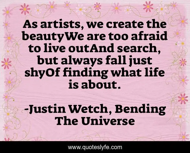 This page presents the quote "As artists, we create the beautyWe are too afraid to live outAnd search, but always fall just shyOf finding what life is about.". Author of this quote is Justin Wetch, Bending The Universe. This quote is about life, art, poetry, poetic, artists, quotes-for-instagram,.