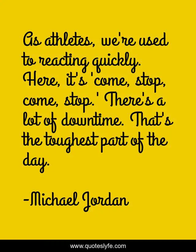 This page presents the quote "As athletes, we're used to reacting quickly. Here, it's 'come, stop, come, stop.' There's a lot of downtime. That's the toughest part of the day.". Author of this quote is Michael Jordan. .